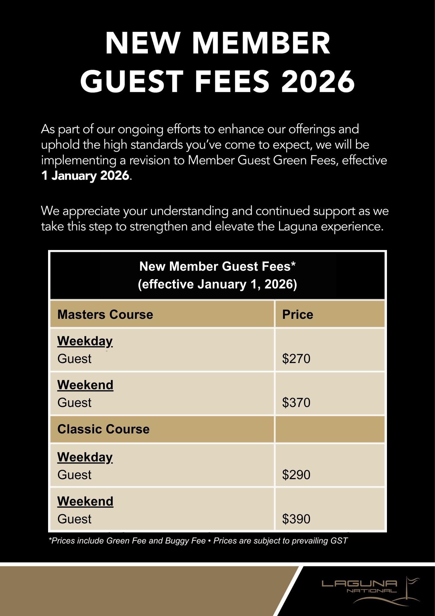 Effective 1 January 2026, we will be implementing a revision to Member Guest Green Fees as part of our ongoing efforts to enhance our offerings and uphold the high standards you've come to expect.